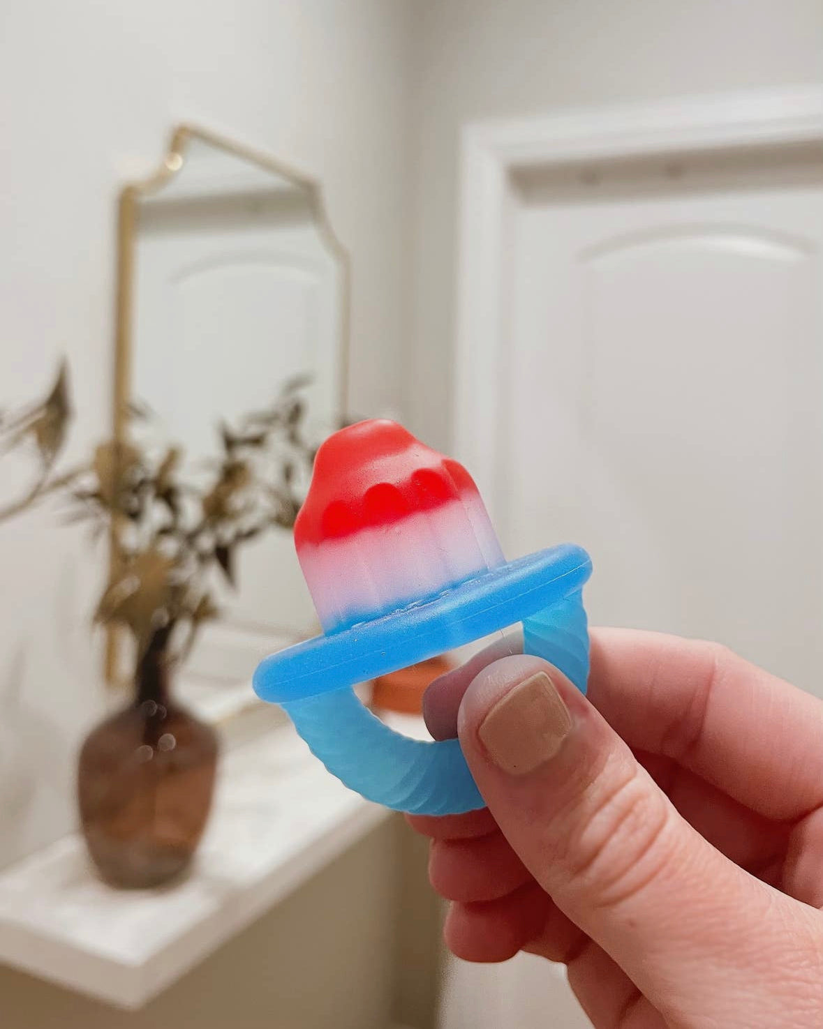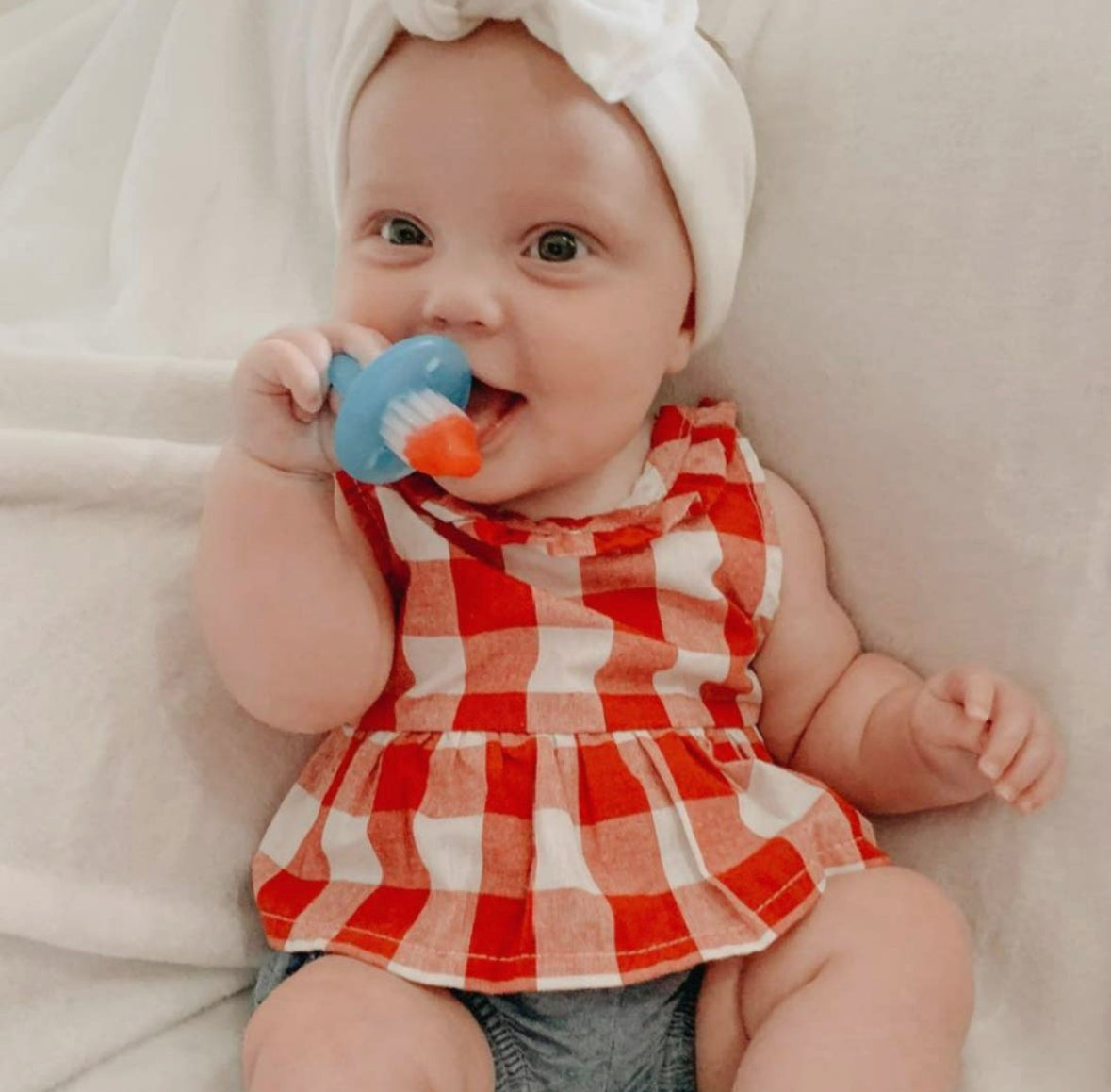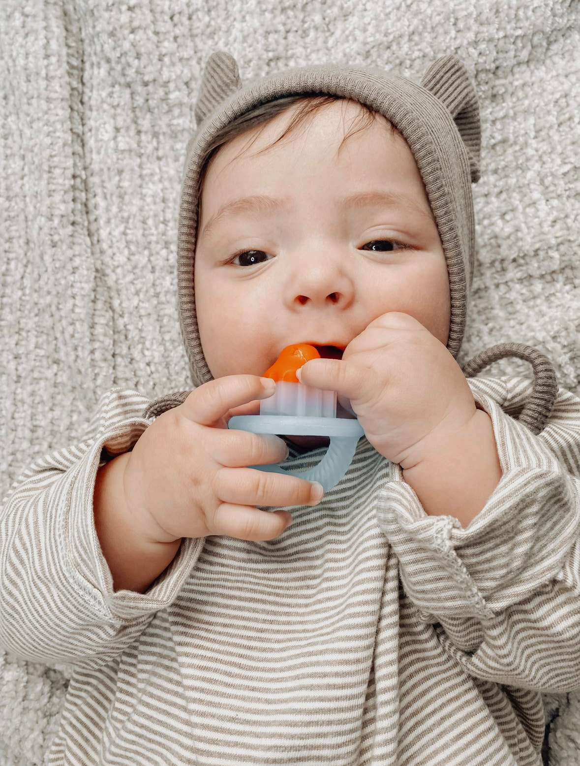 Our Itzy Ritsy, “Teensy Teether™” features a flexible, hollow nipple teether that is made of 100% food grade silicone, making it safe for baby’s mouth, and includes a gentle texture to help soothe sore gums and incoming molars.