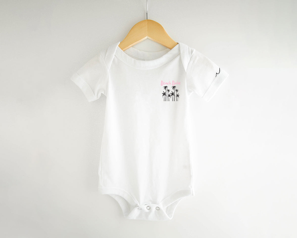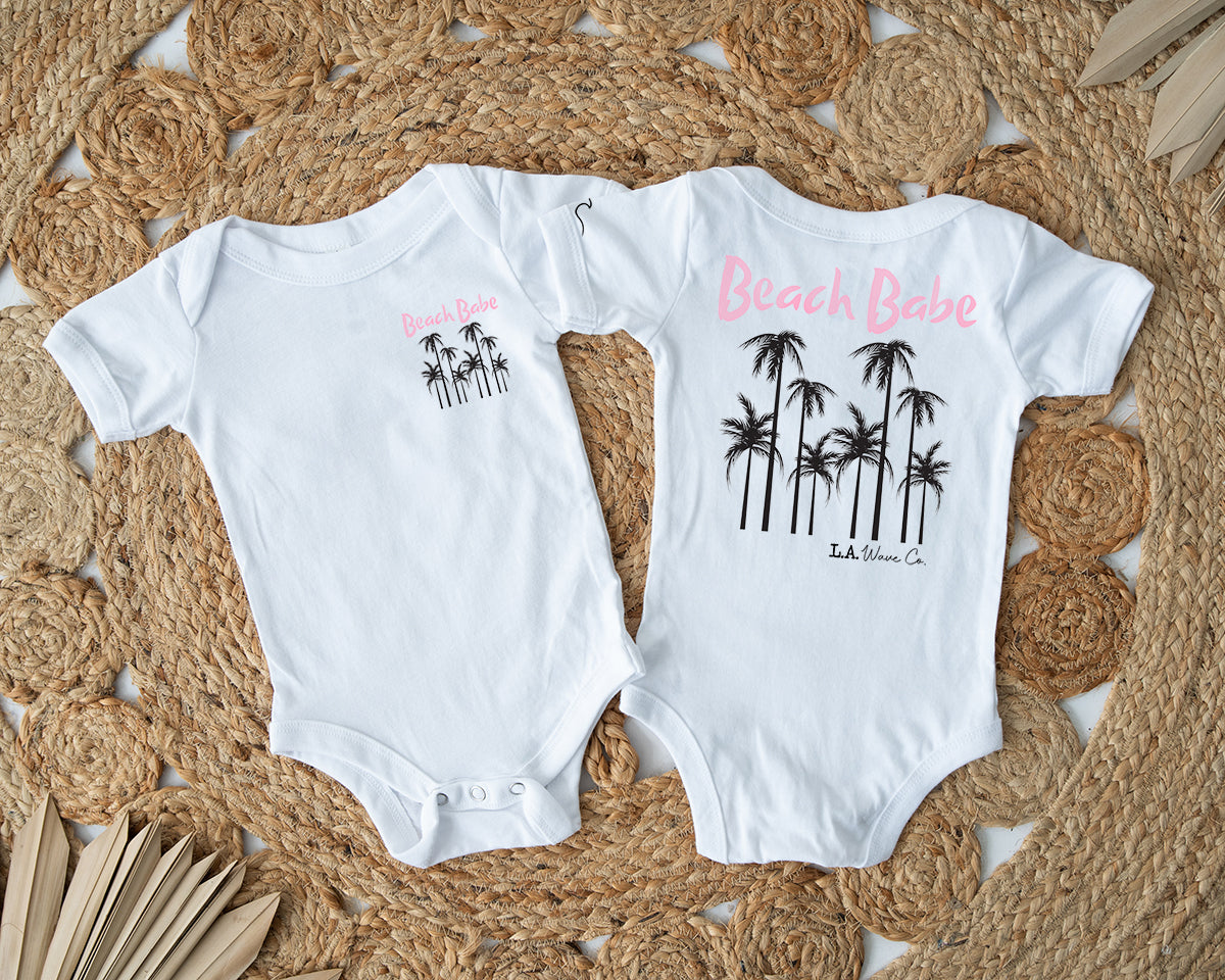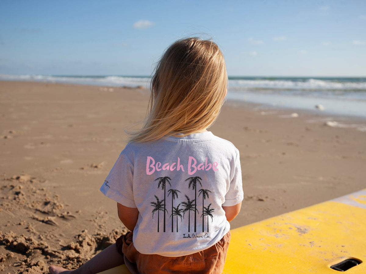 This shirt features our latest "Beach Babe" artwork in bubble gum pink with black palm trees underneath and our classic L.A. Wave Co. logo on the back with a pocket size version on the front. The wearer's left sleeve has our wave logo, and the inside hem has a smile face sure to brighten your little one's day!