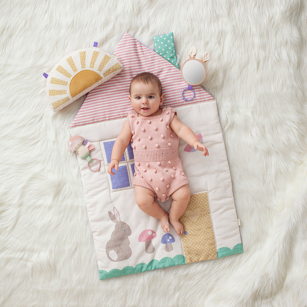 Perfect for tummy time, this adorable Itzy Ritzy tummy time mat is sure to make your little one smile. Special from their Bitzy Bespoke collection, this Cottage play mat is whimsical and fun. The sunshine bolster provides that extra bit of support as your baby grows stronger each day. Also enjoy watching as your baby stares at themselves in the bunny mirror or hold onto the little mushroom toy. Perfect for at home play or for putting in your diaper bag. Mirror and mushroom toys come attached to jump rings so you can easily attach to the stroller for entertainment on the go.
