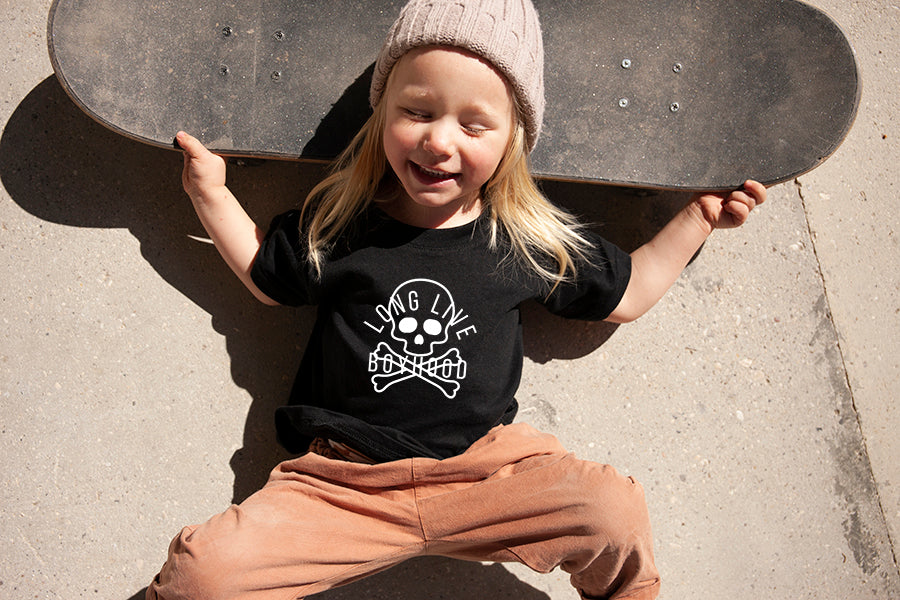 One of our faves! This version of our "Long Live Boyhood" artwork is as tough and adorable as your little man. It features a skull and crossbones design with the words "Long Live Boyhood" on our super soft (perfect for delicate skin) airlume cotton, little babe tee, or onesie.