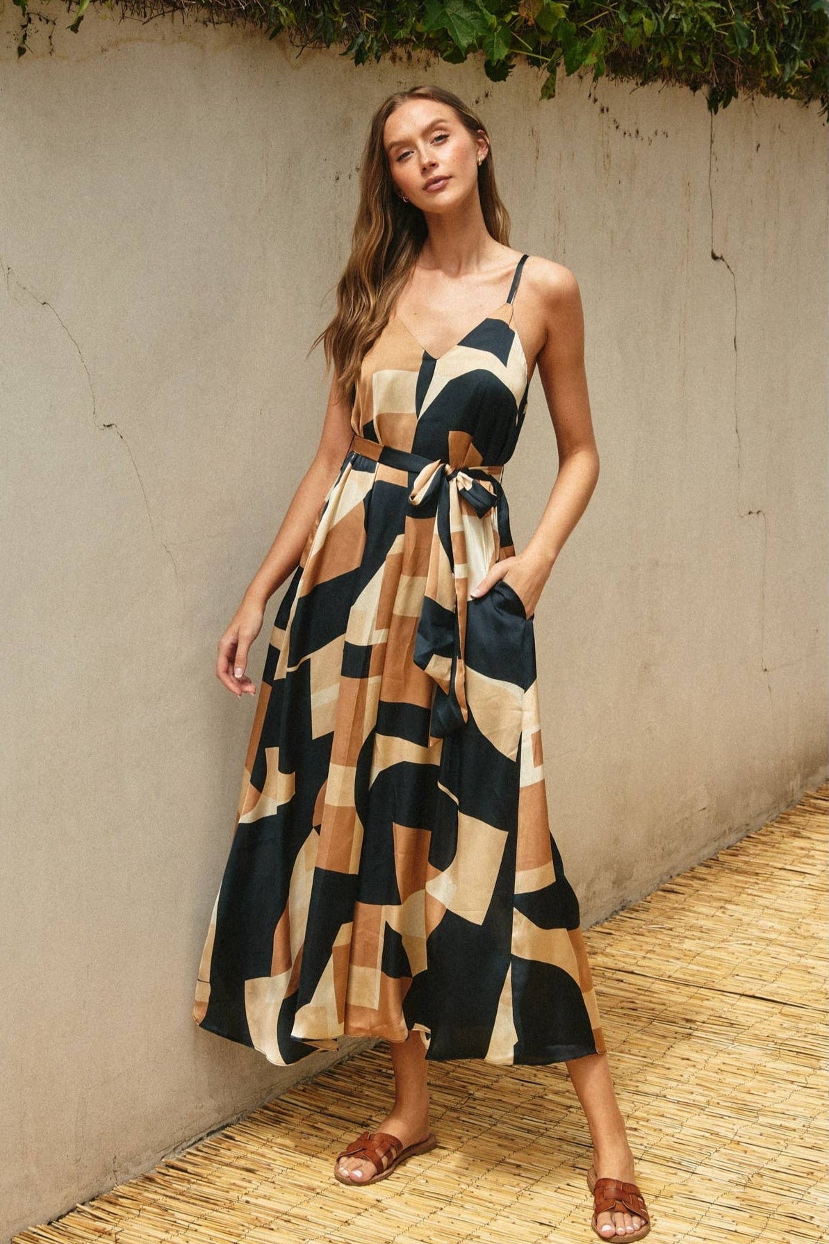 Additional Information: Model is 5'10" and wearing size Small. - Dramatic A-line - Detachable belt - Slender shoulder straps - V-neck on front and back