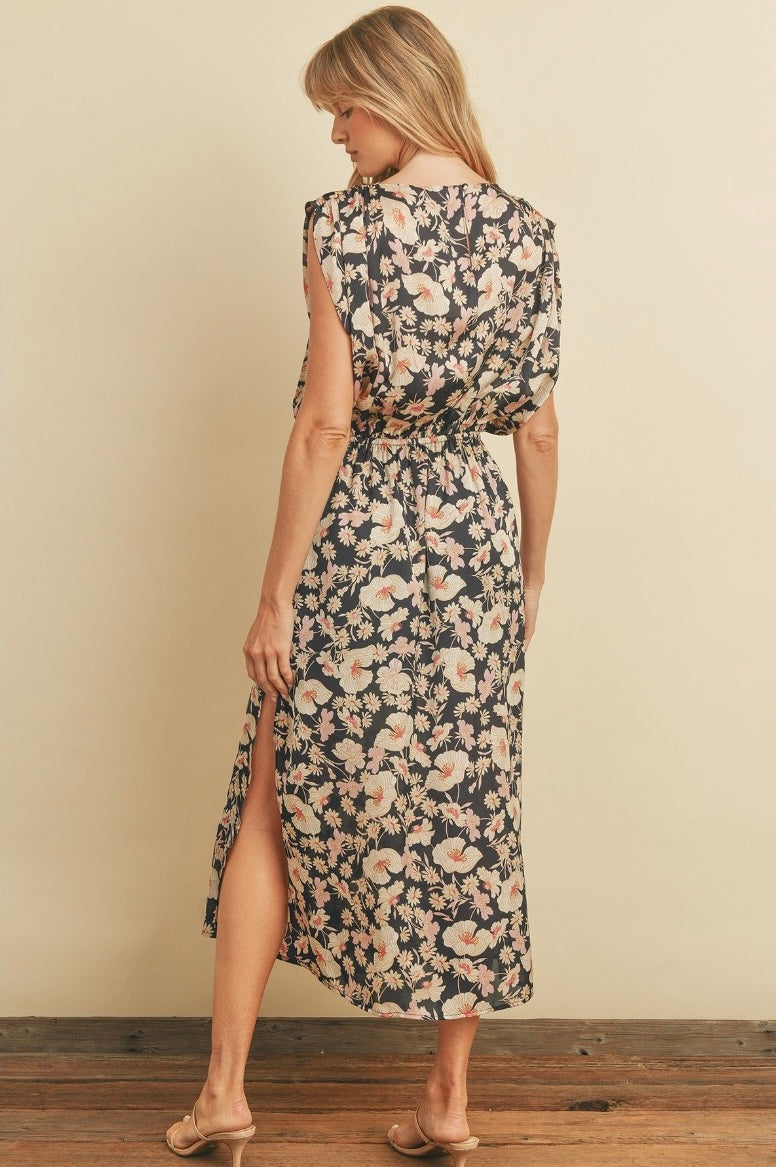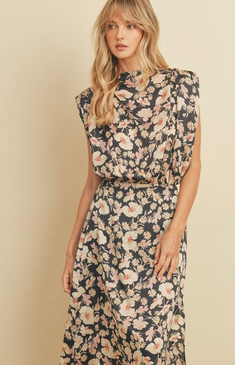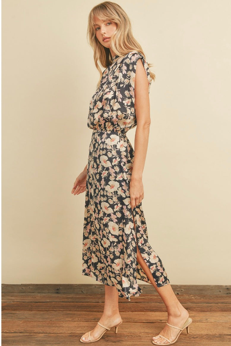 Floral satin dress with high neckline, blusón waist, a-line skirt with slit on wearer's left side, elasticated back waistband, hidden side zip closure, and keyhole closure at back neck.