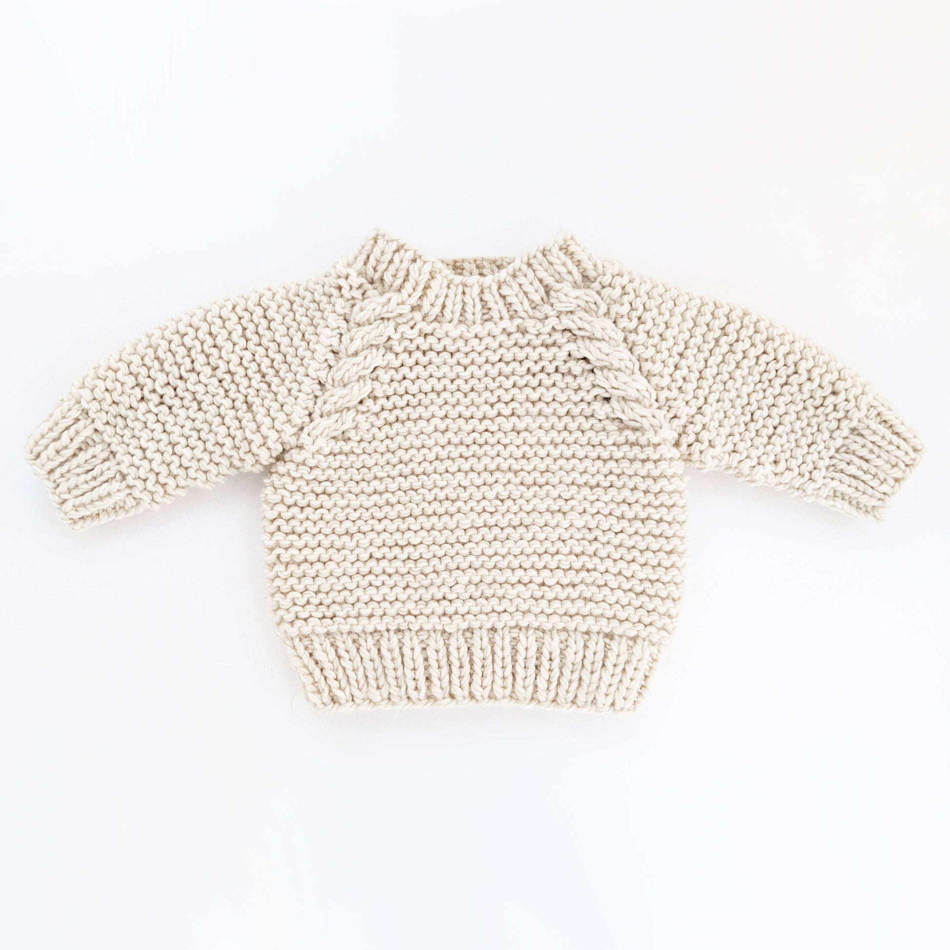 Thick, soft pullover sweater in garter stitch has cable trim raglan sleeves. The neck is softly knit, making it easy to pull over little heads. Hand-knit in beautiful Natural colored yarn, it is cozy and warm. This is such a great gender neutral sweater, perfect for any little person.