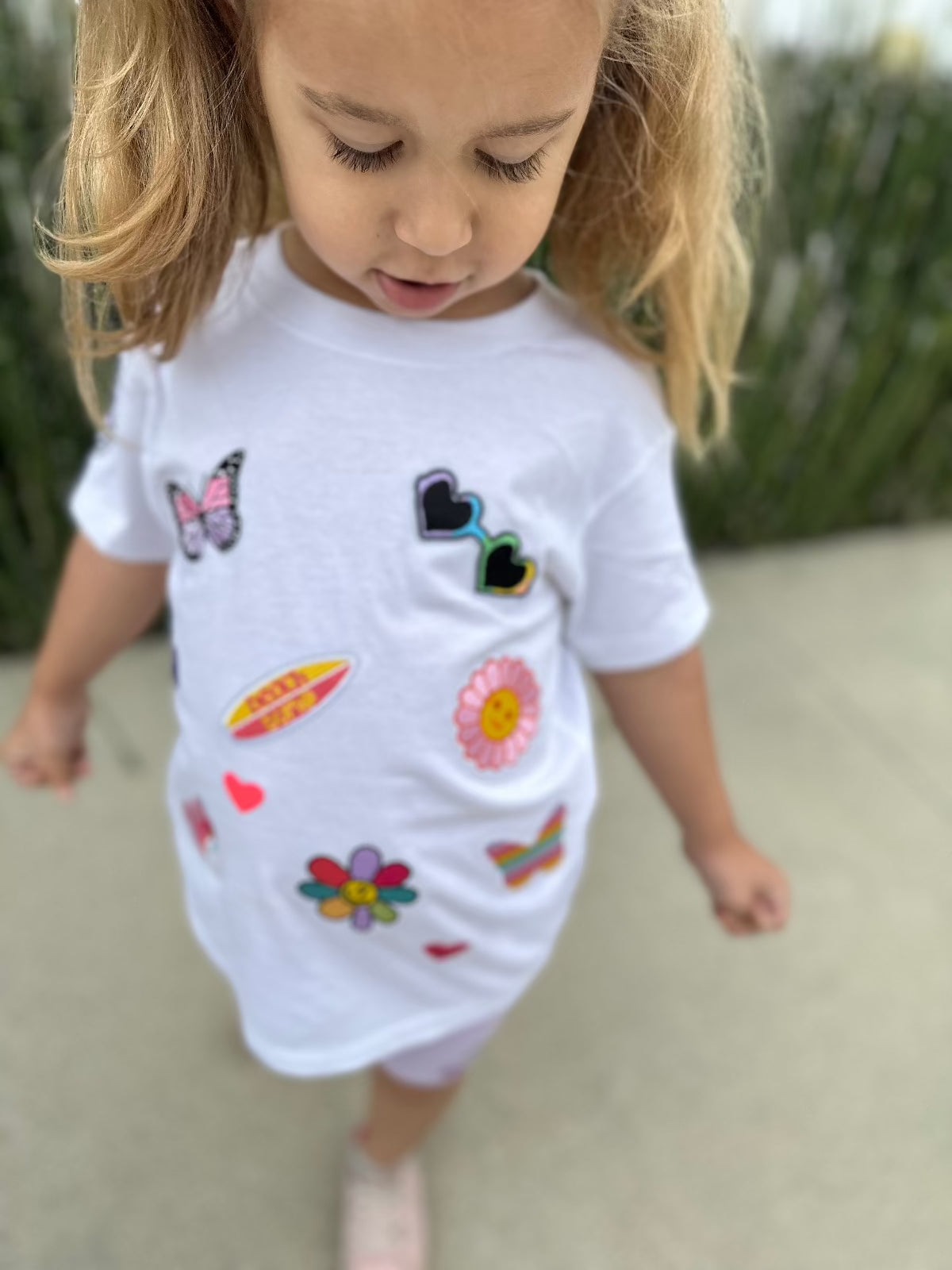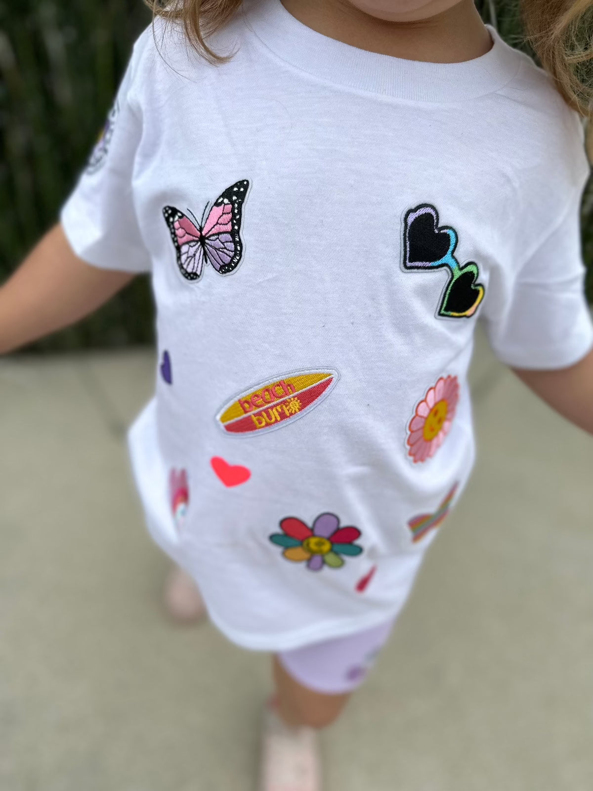 This shirt was designed by our now 4 year old while at play, which is why it feels so fun, colorful, and free! For this tee she added all of her favorite patches so of course there are lots of rainbow colors and butterflies! The back is blank and the inside hem has a hidden smiley face sure to brighten your little one's day!