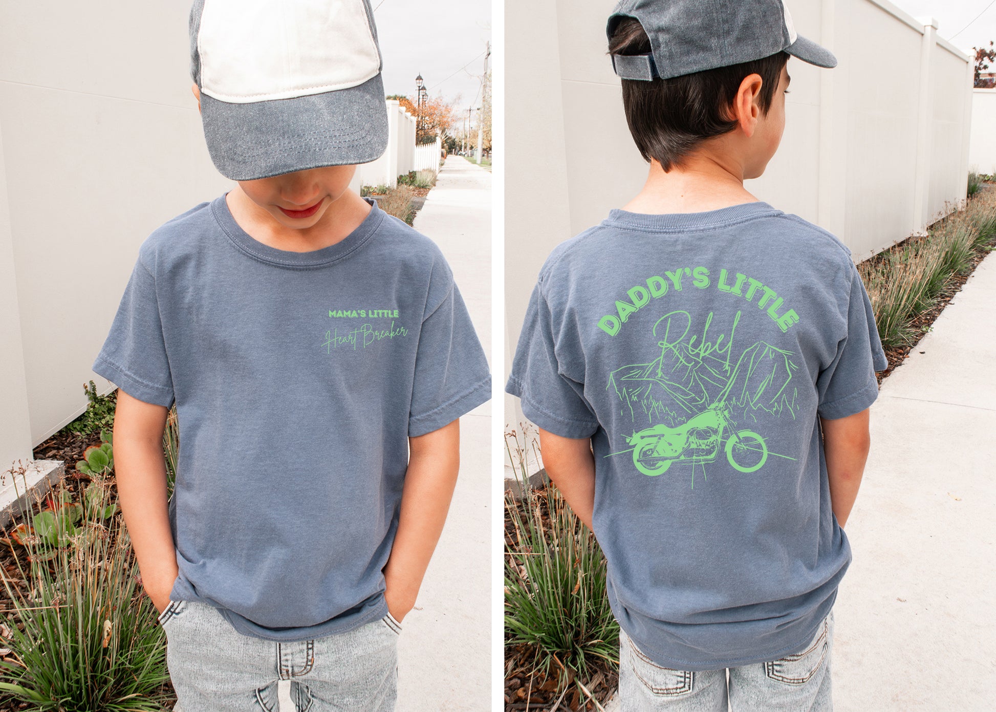 For all of the little rebels out there, this one is for you! The front features text that says "Mama's Little Heartbreaker", while the back says "Daddy's Little Rebel". As always the inside hem has a hidden smiley face sure to brighten your little one's day!