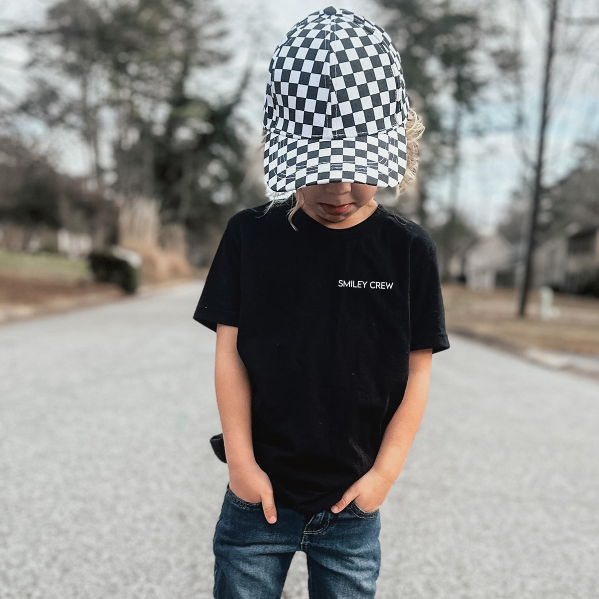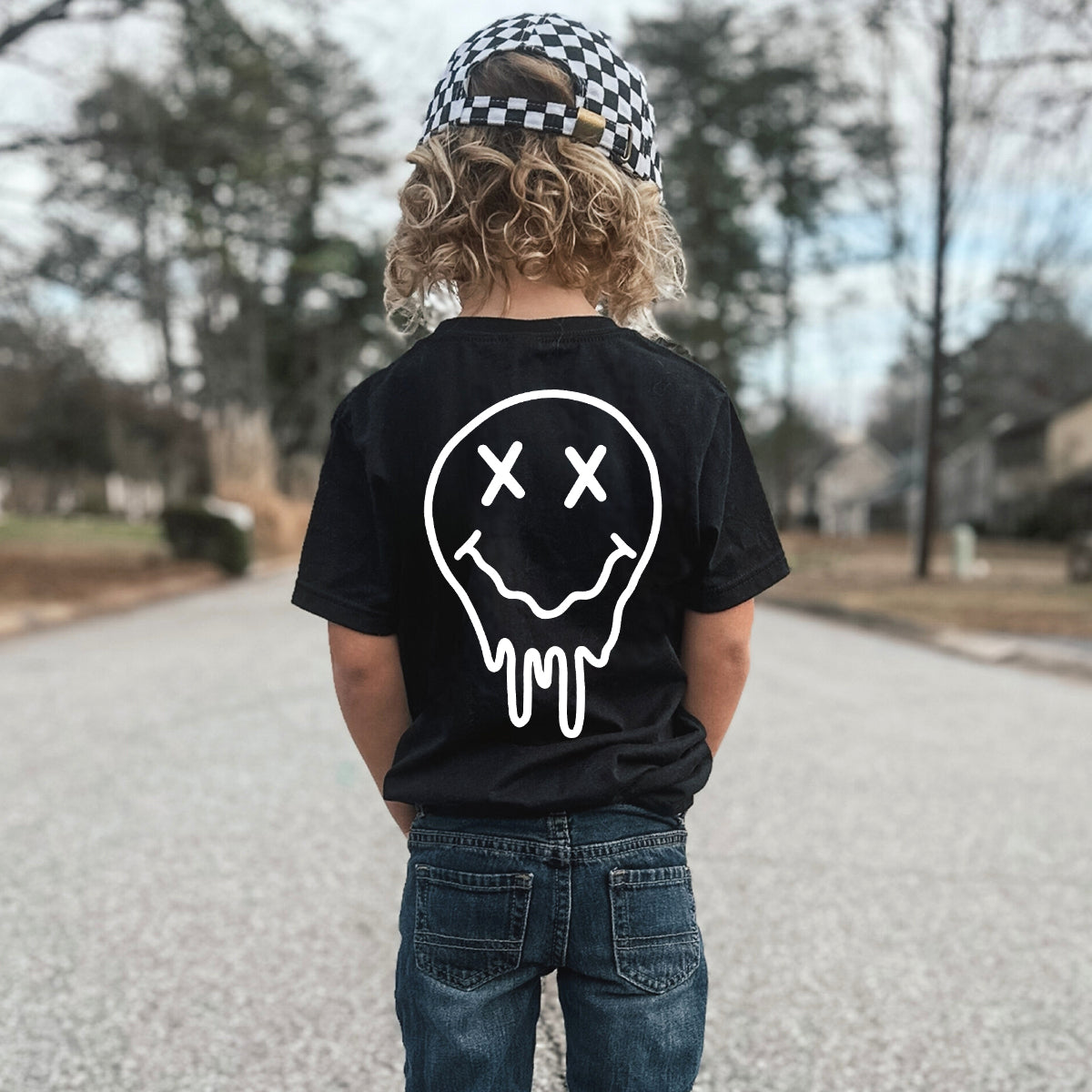 This shirt features an oversized dripping smiley face in white on the back and text "Smiley Crew" on the front. The inside hem has a hidden smiley face sure to brighten your little one's day!