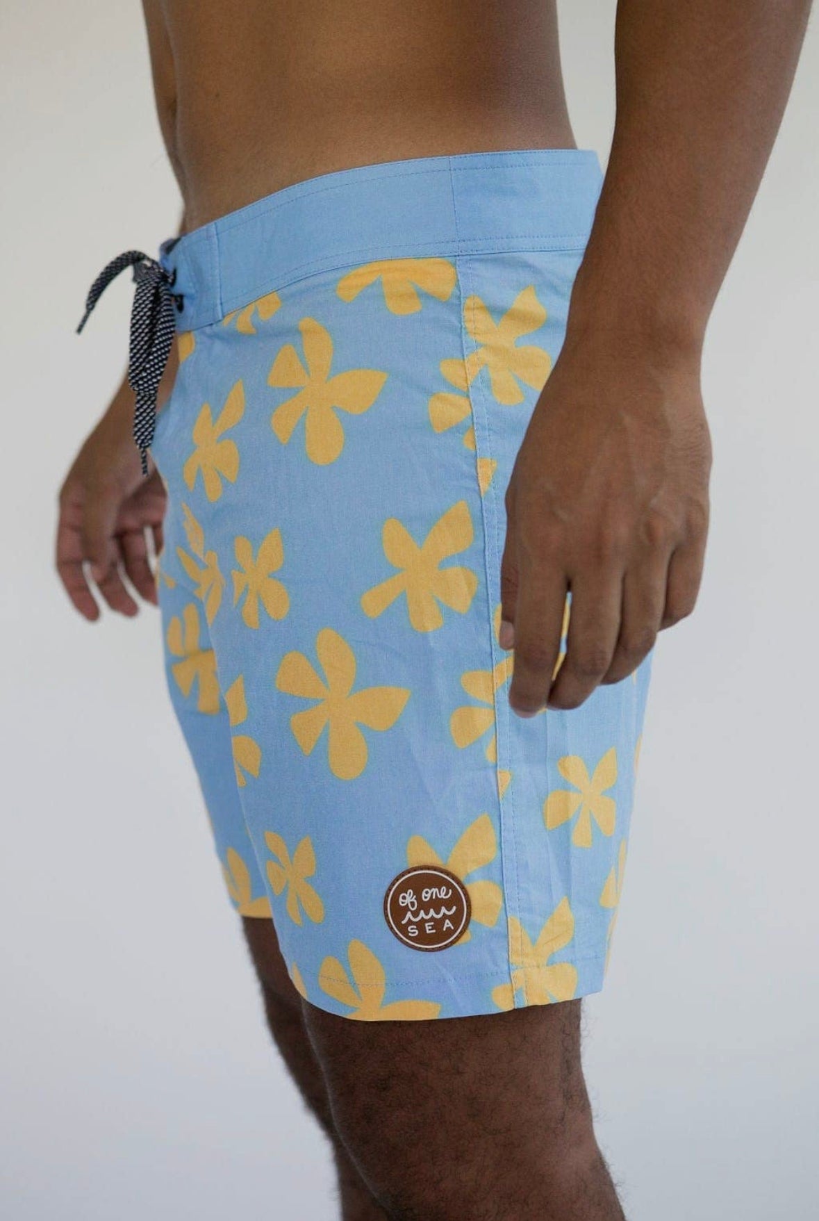 Stoked to now sell pieces from “Of One Sea’s” swim collection! These board shorts are in a light blue color with yellow plumeria print and feature an “Of One Sea” logo patch + black and white drawstring at the front.