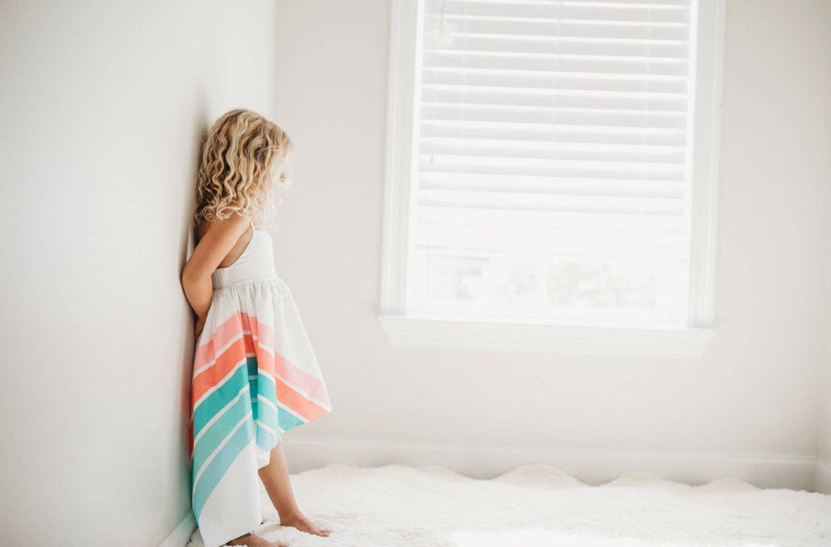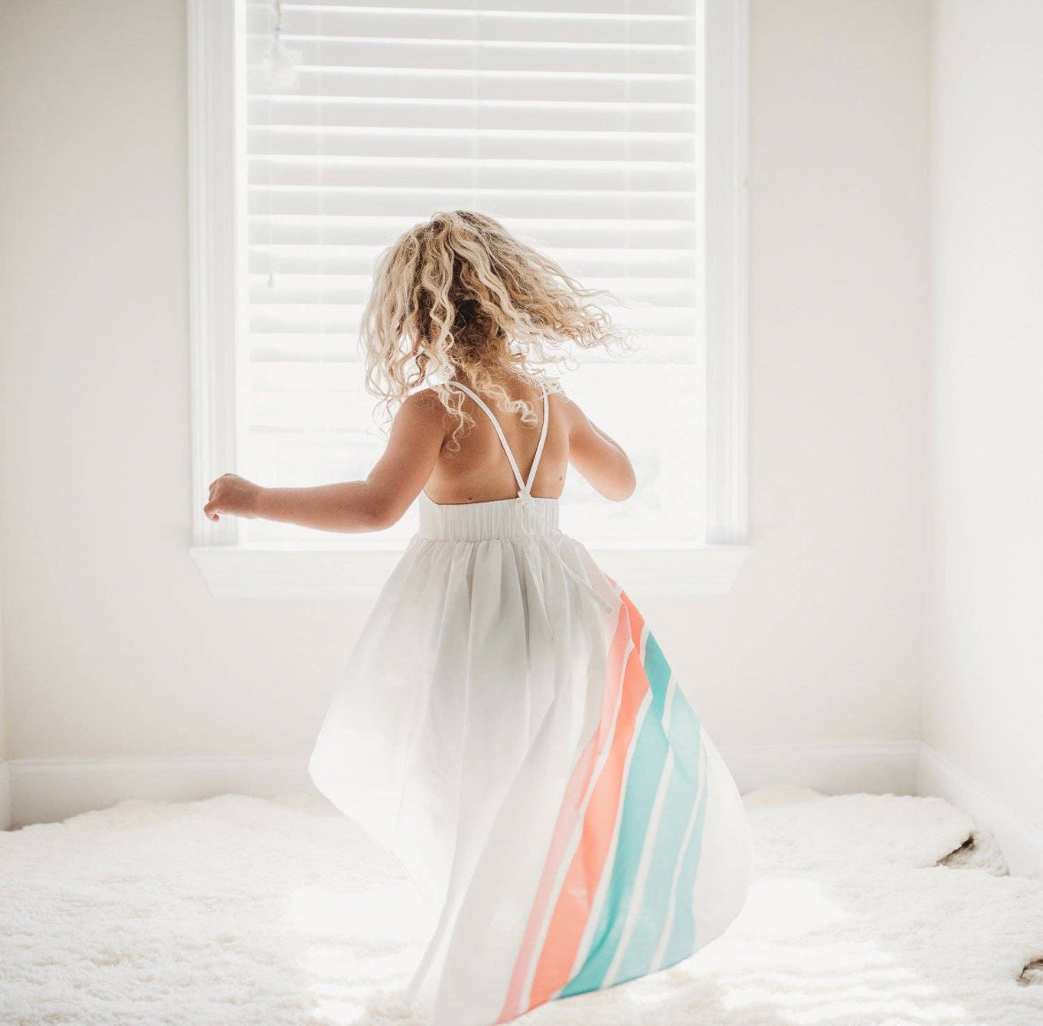 White sleeveless Hi-Lo dress with pastel rainbow print and tie back detail. Perfect for some fun in the sun!