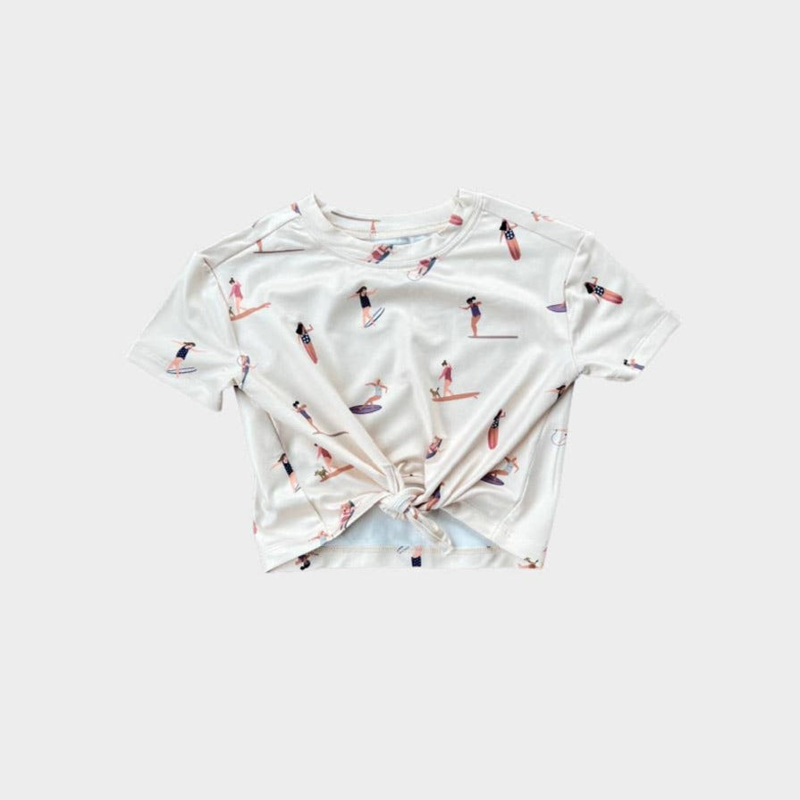 This adorable tie front shirt is made with the softest and comfiest bamboo fabric, and features an adorable "Girl's Surf" print!