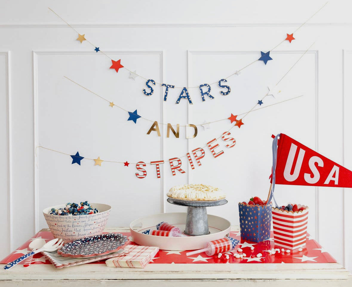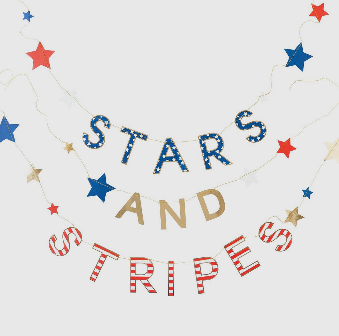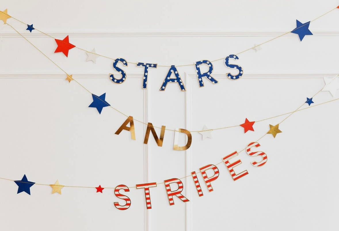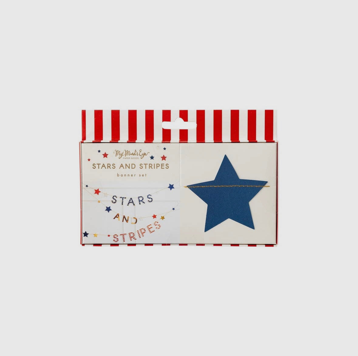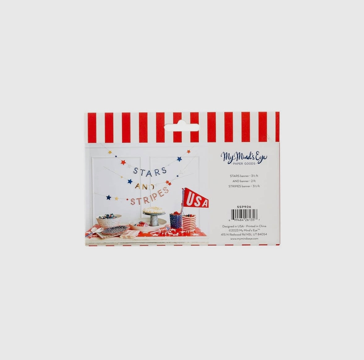 Product includes thee separate banner pieces, each with one word from “Stars and Stripes”.